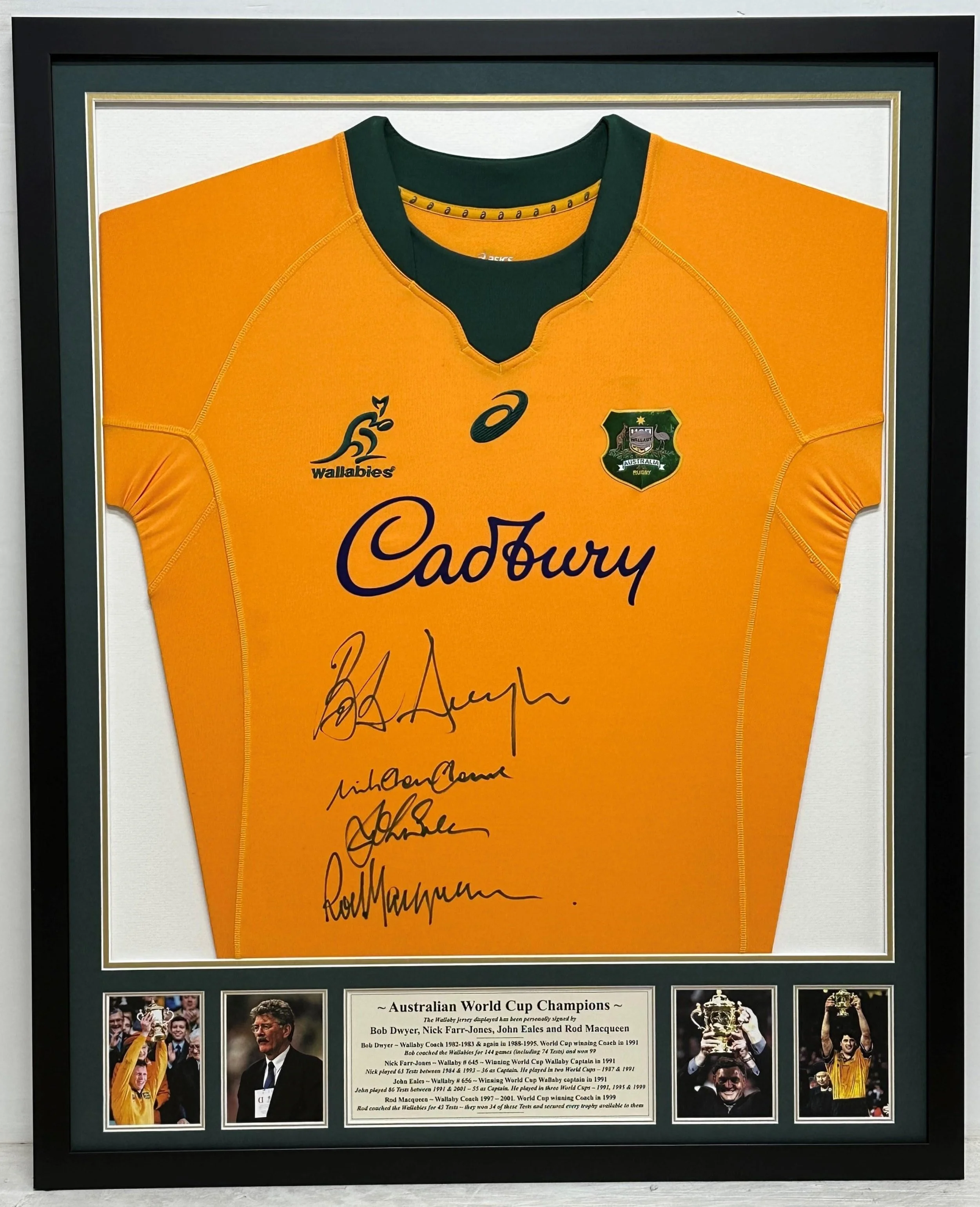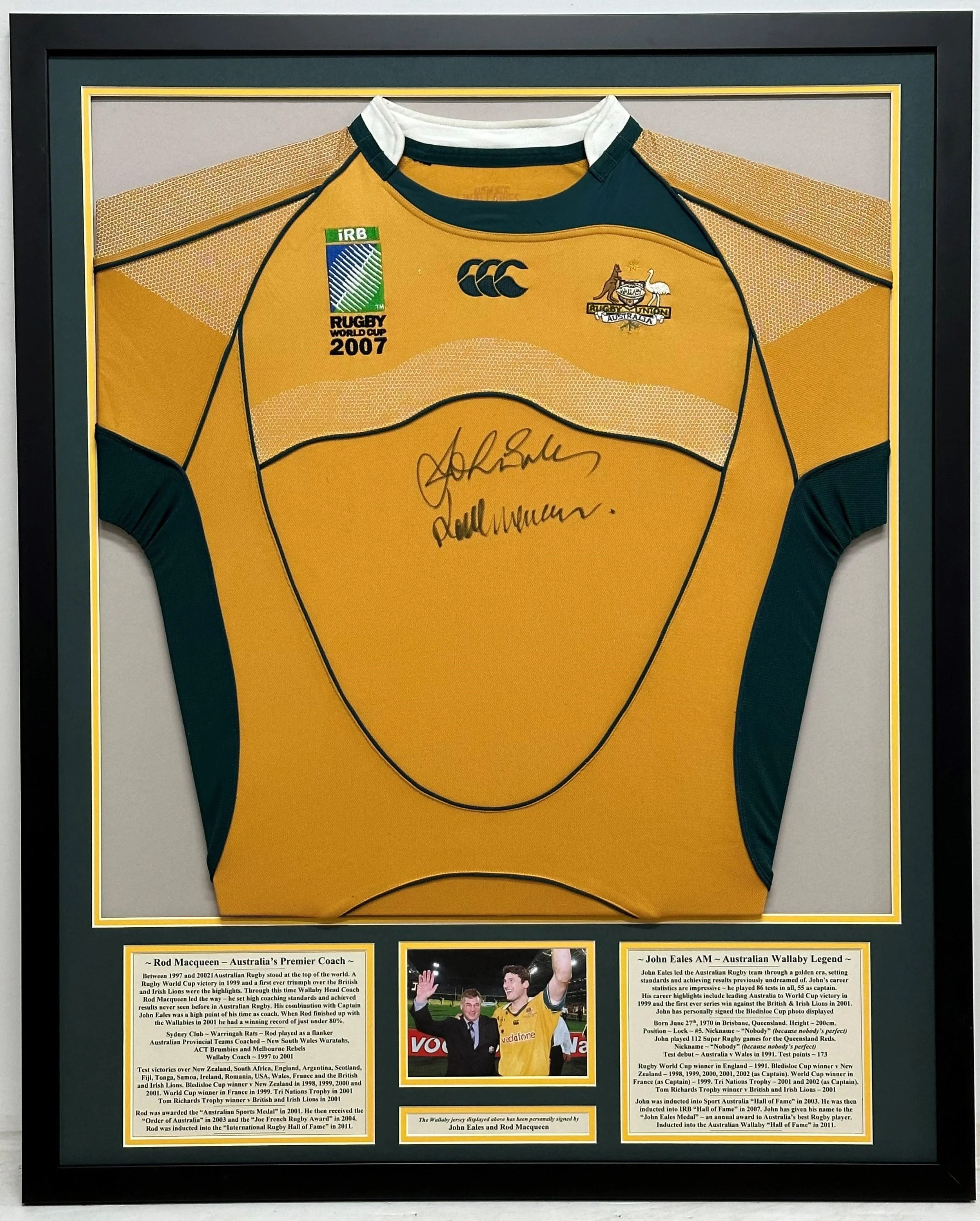 Personally signed by 1999 RWC Winning Coach Rod MacQueen and Captain John Eales